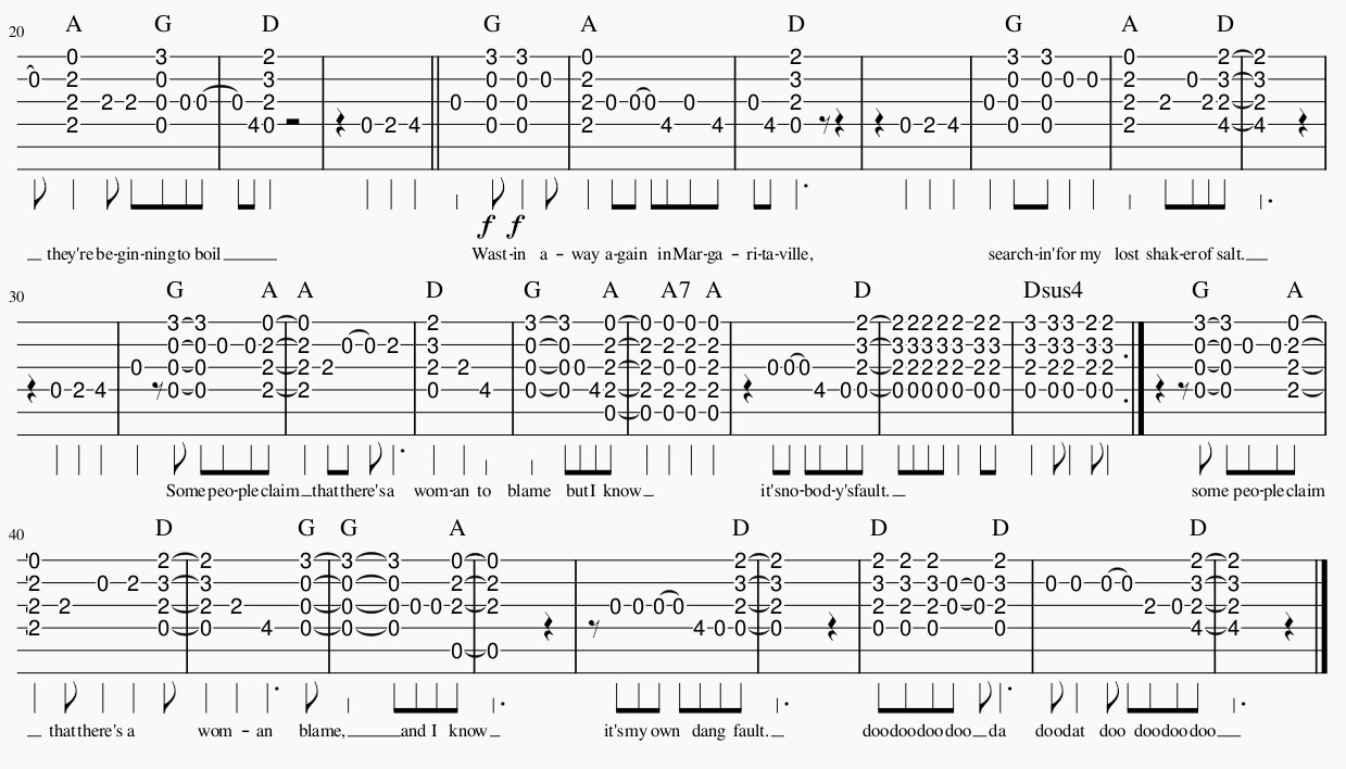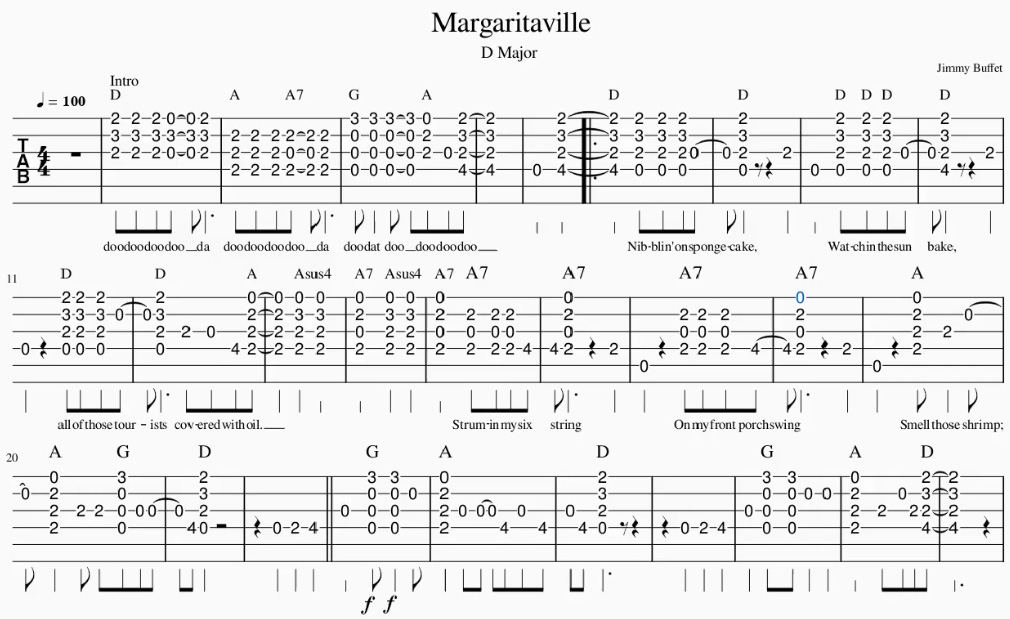 This Jimmy Buffett tune is a popular campfire song. It uses mostly D, G, and A, with some sus versions and a few pulloffs. Use your imagination to make variations. on the strum