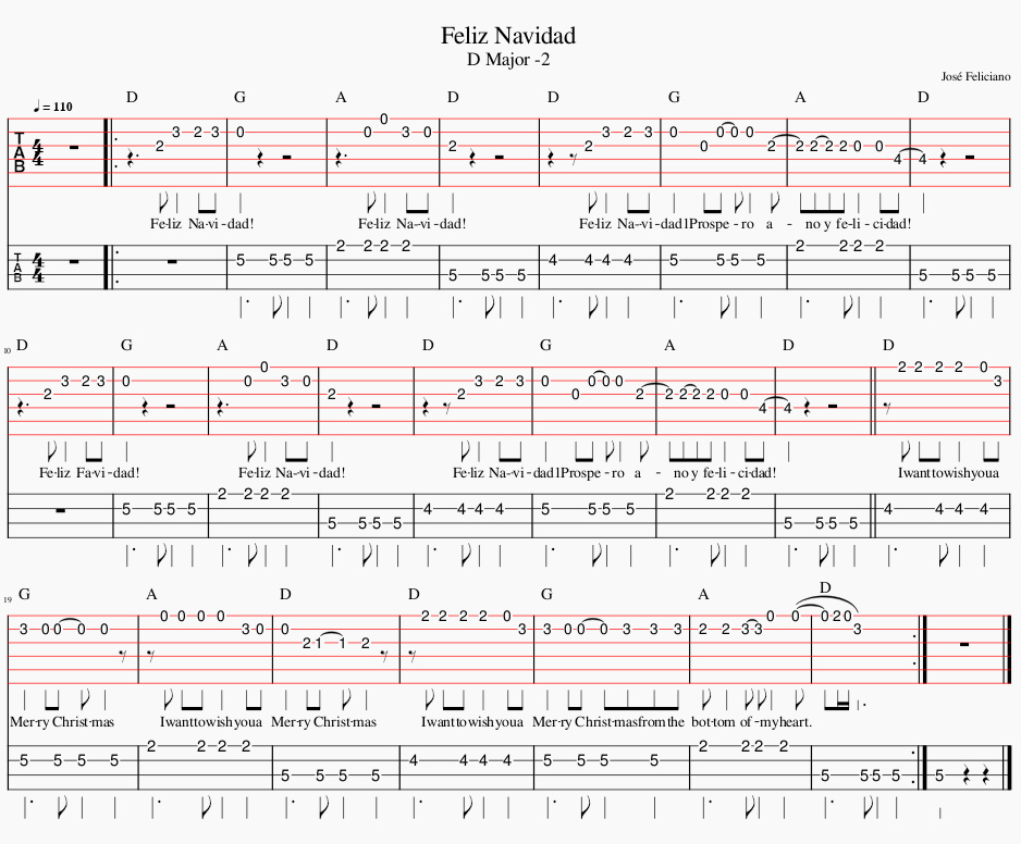 Here are the Lead and Bass parts for "Feliz Navidad" in D. The rhythm guitar part just cycles through D-G-A-D.