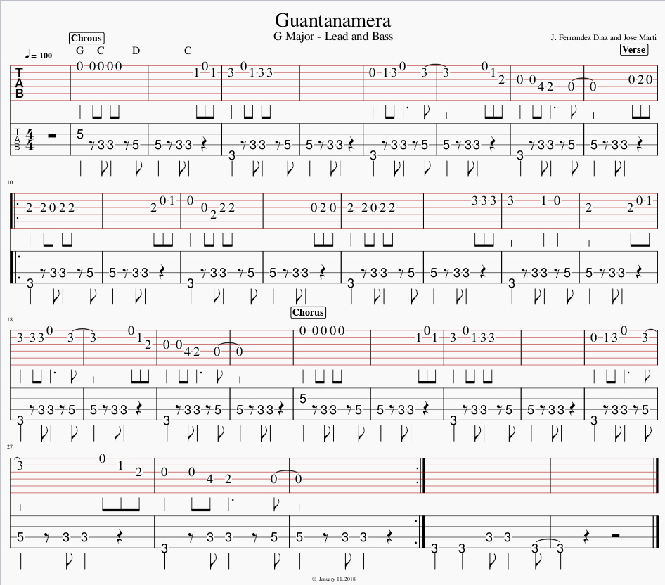 Here are the Lead and Bass parts for "Guantanamera" in G. The rhythm guitar part just cycles through G-C-D-C over and over again.